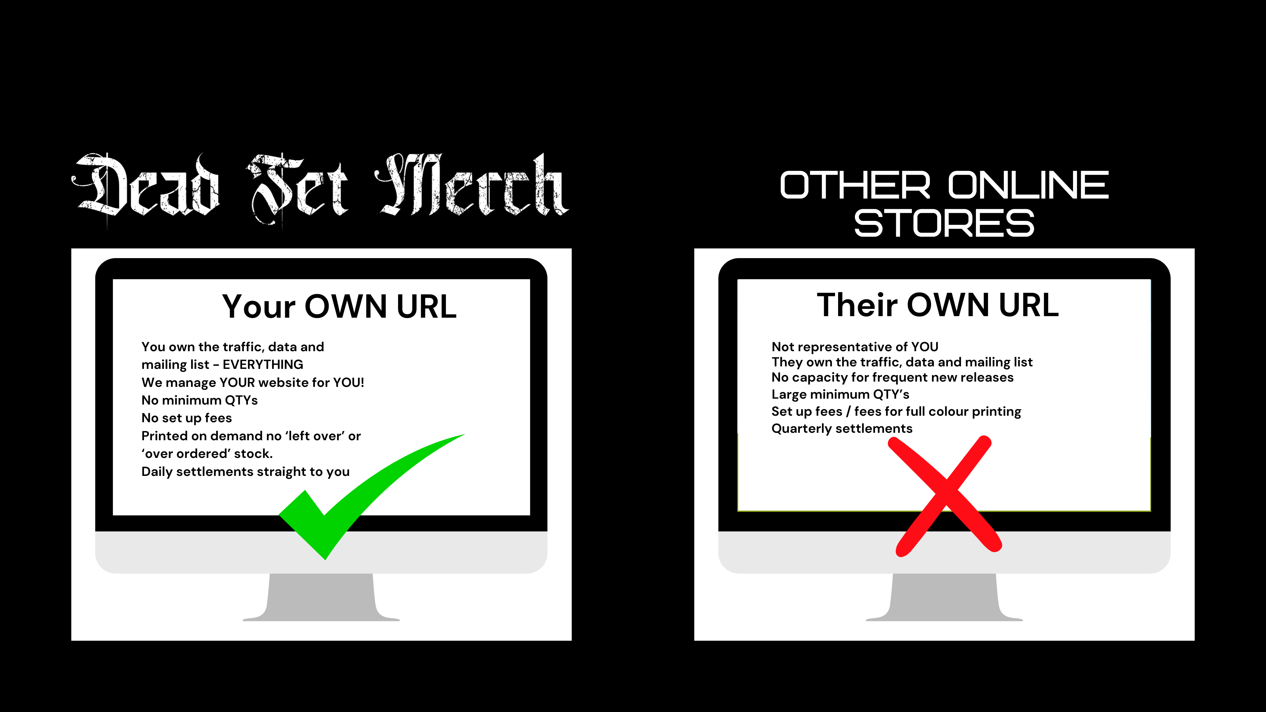 At Dead Set Merch we have 20+ collaborative years of experience in touring merchandise, online marketing (SEO | Paid Advertising | Email marketing), website building & merchandising, garment printing, product sourcing and much more!